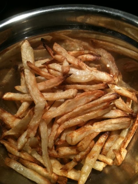 In a large bowl, dress the fries very lightly with EVOO – a couple of turns of the bowl ought to do the trick. Season with salt and pepper, then arrange the fries in single layer without crowding either baking sheet.